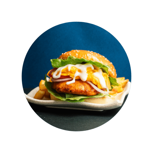 Shallow-fried potato patty seasoned with Indian spices sandwiched between burger buns along with lettuce, tomato, onion and cheese