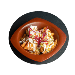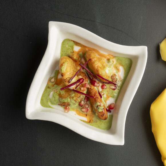 Mashed potatoes mixed with spices, herbs and peas deep-fried, served hot with tamarind, mint chutneys and yogurt